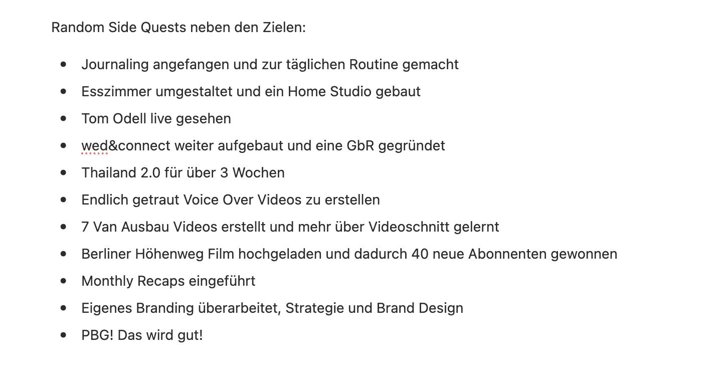 Natürlich habe ich mich im Dezember auch mit Zielen im neuen Jahr beschäftigt und da gibt es einige. Ich habe mir dafür einen persönliche OKR Goal Tracker in Notion gebaut. Das gleiche System hatte ich schon für das Jahr 2025 und konnte so nun analysieren, welche Ziele ich erreicht habe, welche ich meilenweit verfehlt habe (ähm, einmal die Woche meditieren zum Beispiel. Ups.) und auch was ich zusätzlich erreicht habe und nie ein Jahresziel war.