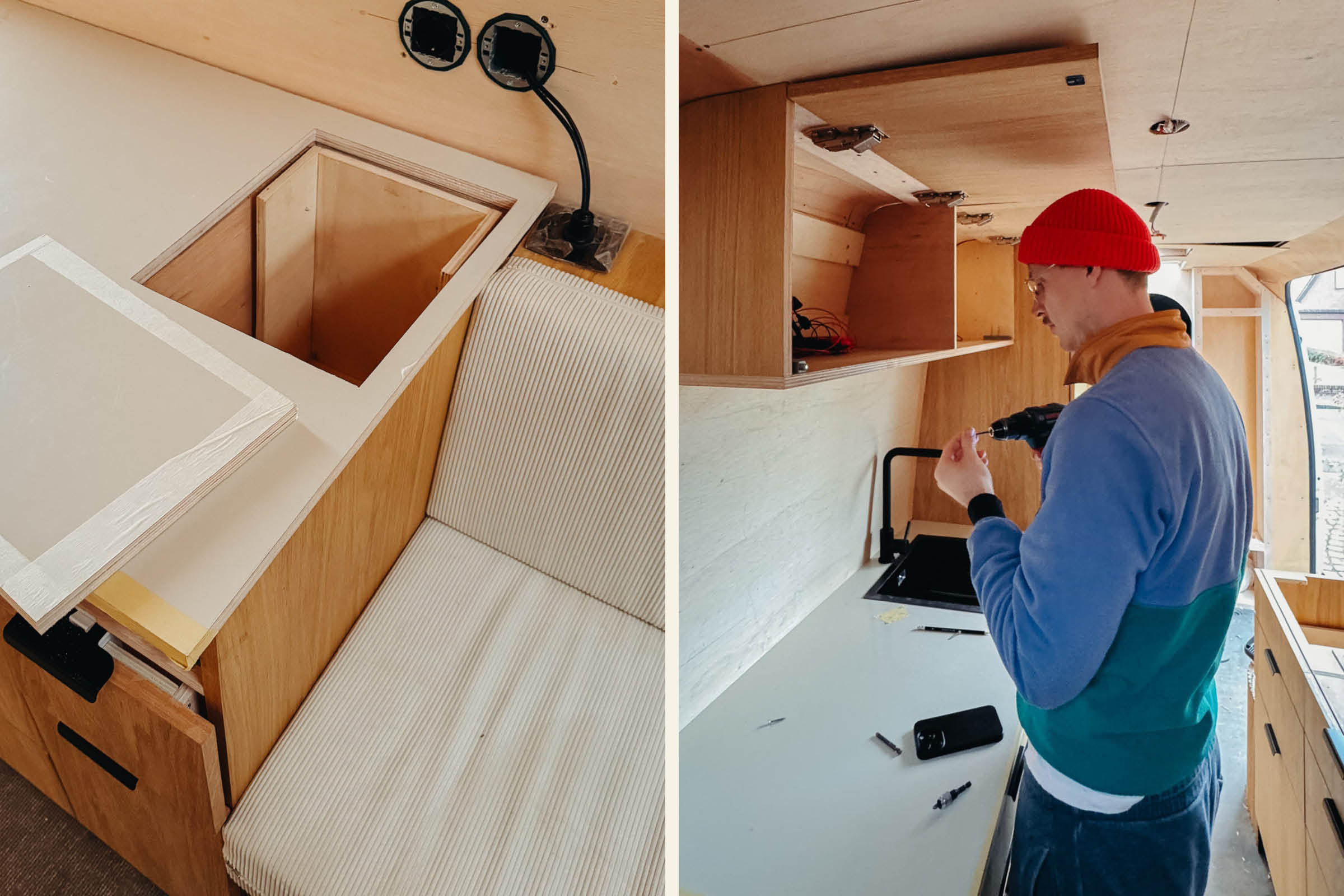 Im November hieß es beim Van-Ausbau zwei Schritte vor, und wieder einen zurück. Wir haben uns entschieden, doch noch eine Heckverbreitung in den Van einbauen zu lassen. Dafür mussten wir bei fast 0 Grad den Oberschrank und zwei Seitenwände abnehmen. Zuvor hat Felix aber noch den herausfahrbaren Lift für die Kaffeemaschine in die Küchenplatte gebaut, sodass immerhin der Punkt abgehakt war. Das war tatsächlich ein Detail, das wir deutlich schwieriger eingeschätzt haben und dieses mal direkt auf Anhieb klappte. Manchmal läuft es auch gut.
