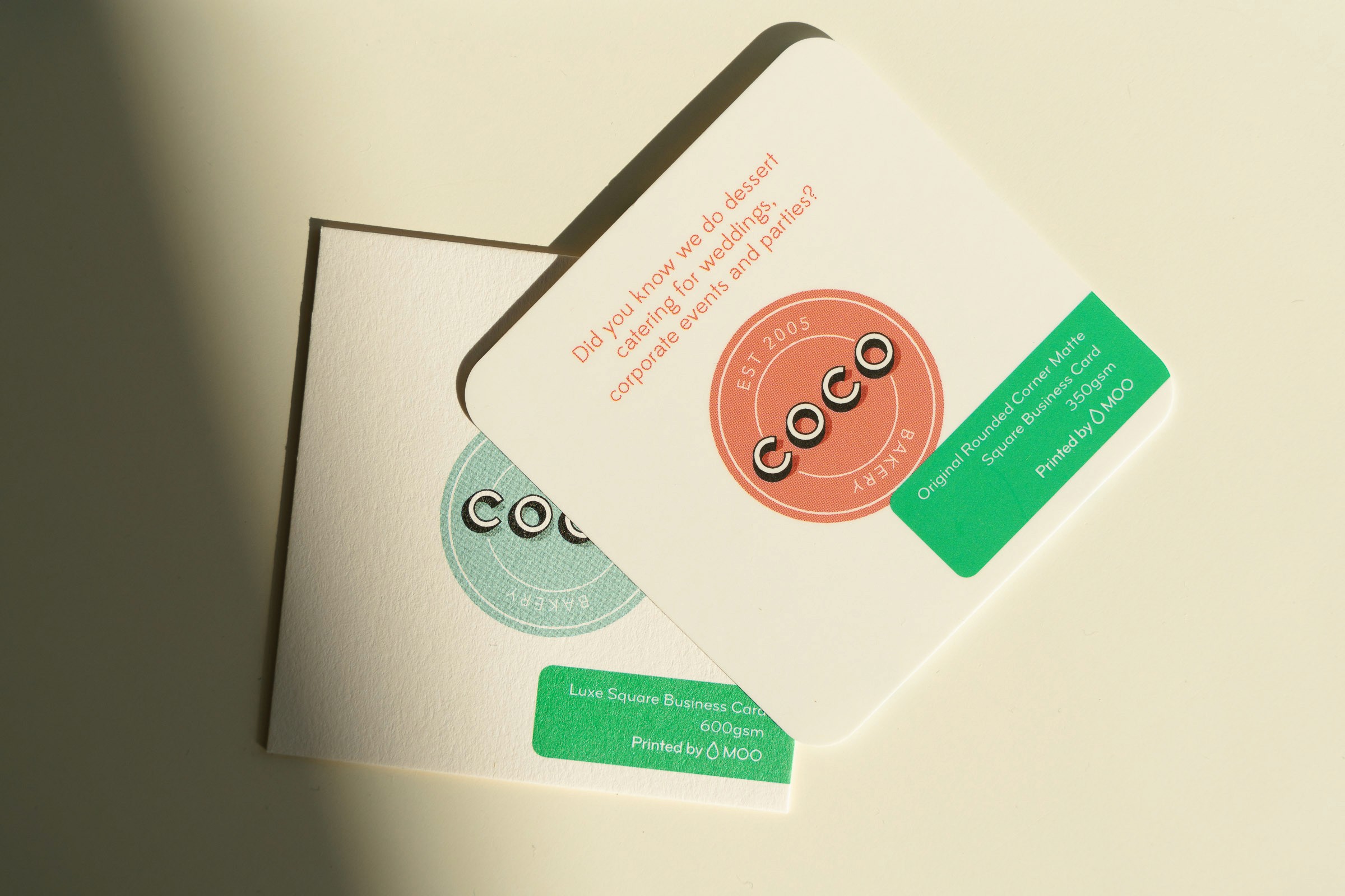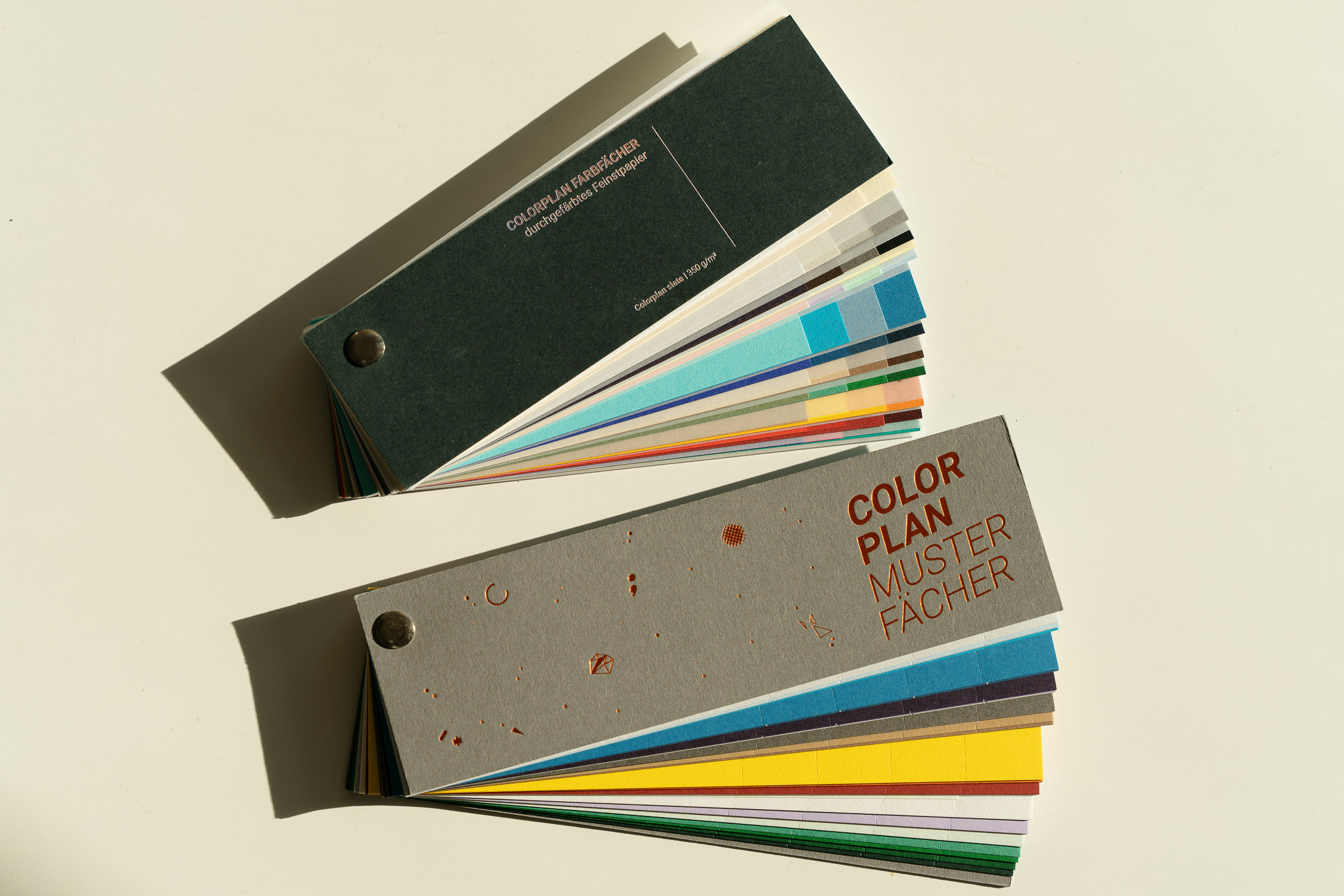 Farbe ist ein großer Bestandteil einer Markenidentität. Am besten wirkt sie, wenn das Papier selbst schon farbig ist, nicht nur der Druck. Die Colorplan Papiere von G.F Smith liebe ich, weil sie so eine breite Palette an satten, tiefen Farbtönen haben. Das Besondere an diesen Papieren ist, dass die Farbe durch das gesamte Papier geht, nicht nur die Oberfläche. Das bedeutet, auch der Schnitt der Karte hat Farbe. Kleine Details, die aber eine große Wirkung haben.